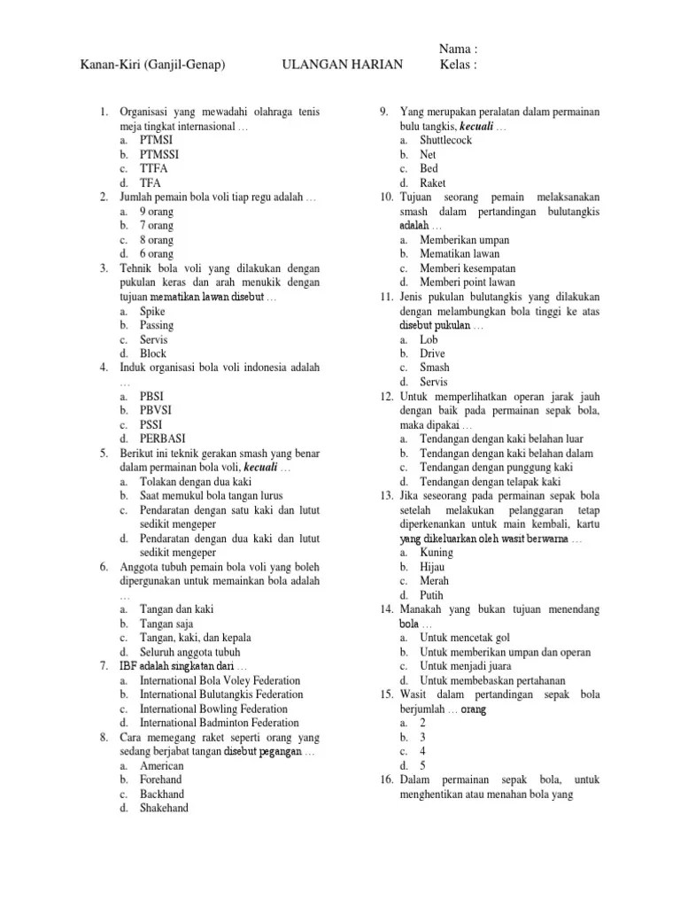 Buku ini adalah buku terbaru untuk vii. berikut penjelasannya yang mengutip dari situs kementerian pendidikan dan kebudayaan (kemdikbud):. Karena dribbling adalah salah satu teknik dasar dalam sepak bola. Bagian kepala yang tepat bersentuhan dengan bola dalam menyundul bola adalah . . . . a. bola basket dimainkan pada lapangan yang berukuran panjang 26 meter dan lebar 14 meter.