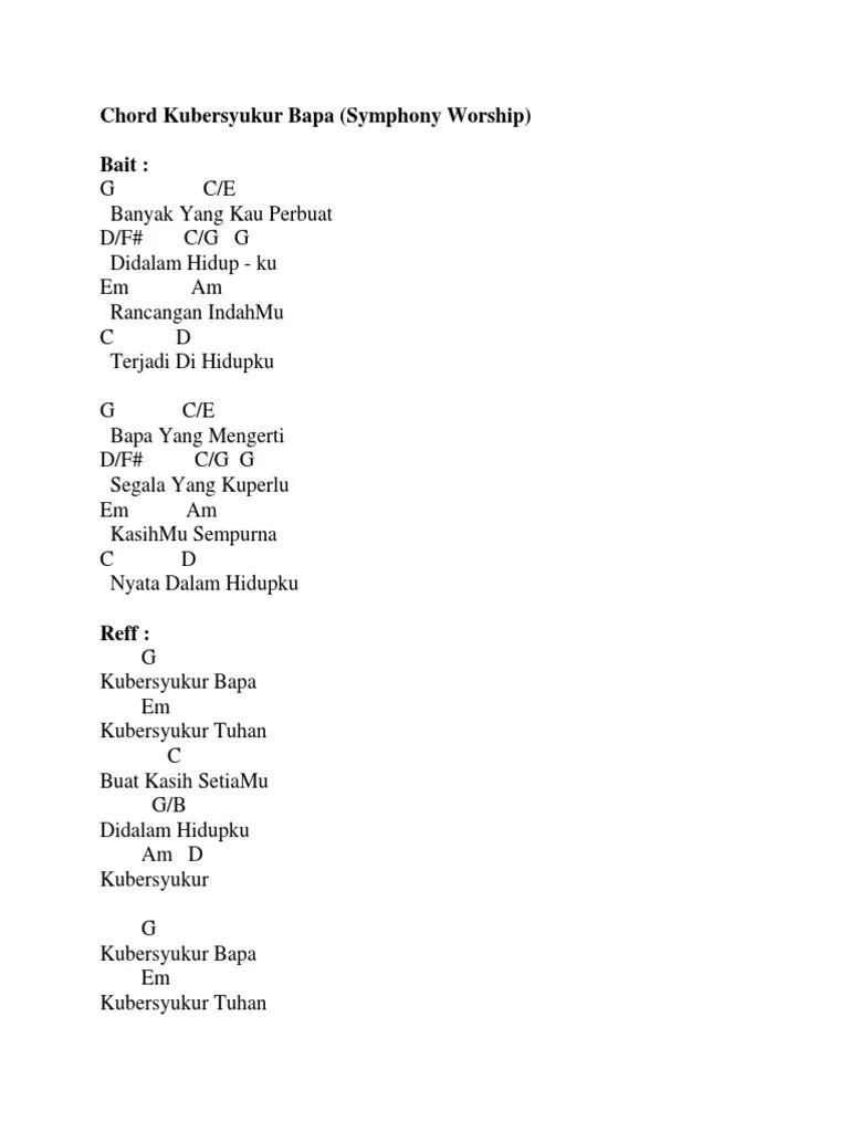 Berikut ini lirik dan chord lagu kubersyukur bapa dari symphony worship. Kasih allah mau berkorban bagi kau dan aku. verse 1 g c banyak yang kau perbuat. F#m kubersyukur kar'na kasih setiamu bsus b e b11 s'lalu baru, . Download lagu mp3 & video: